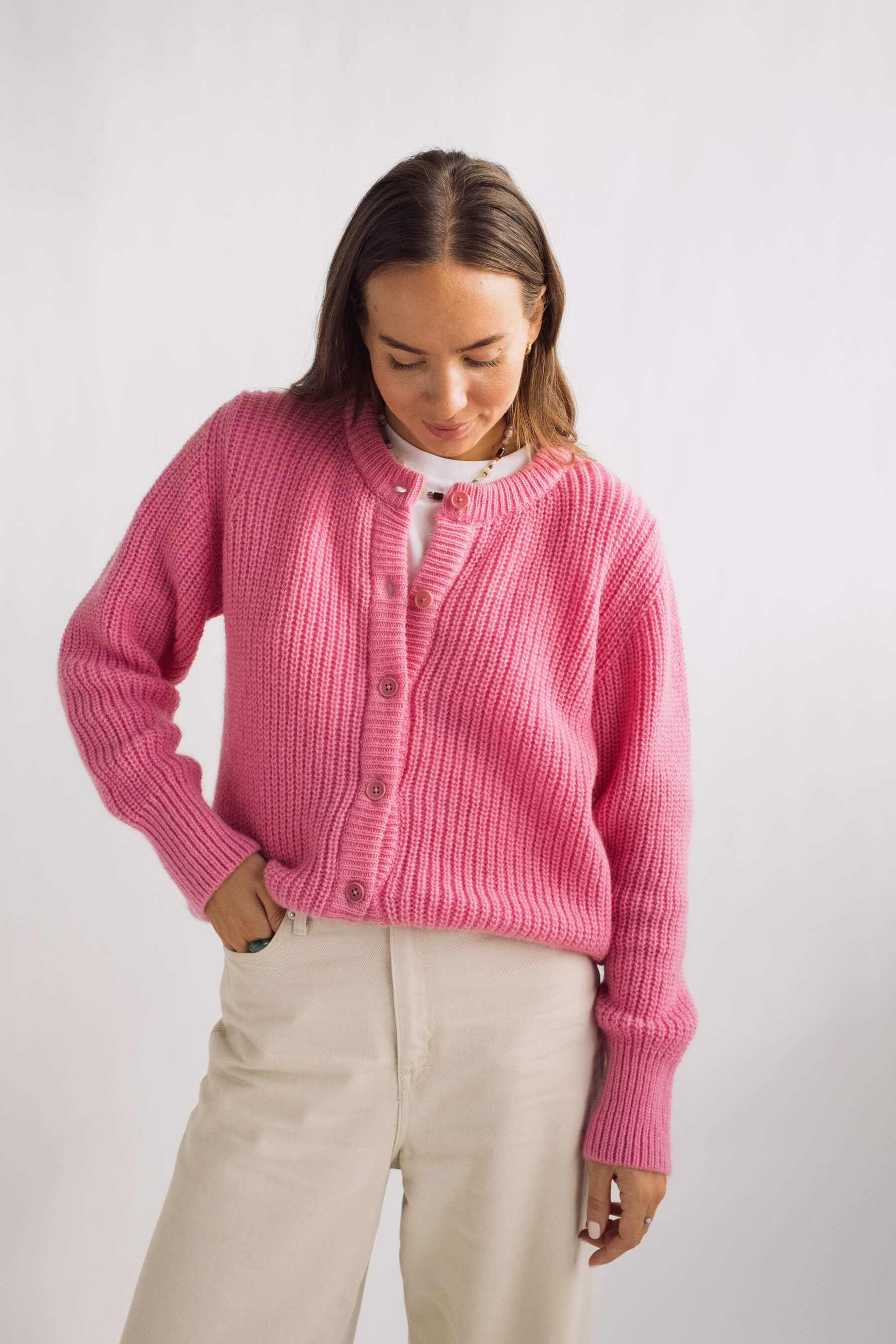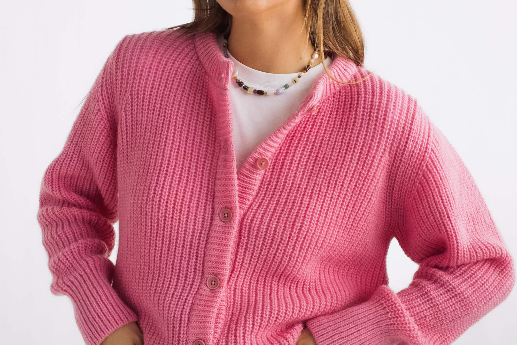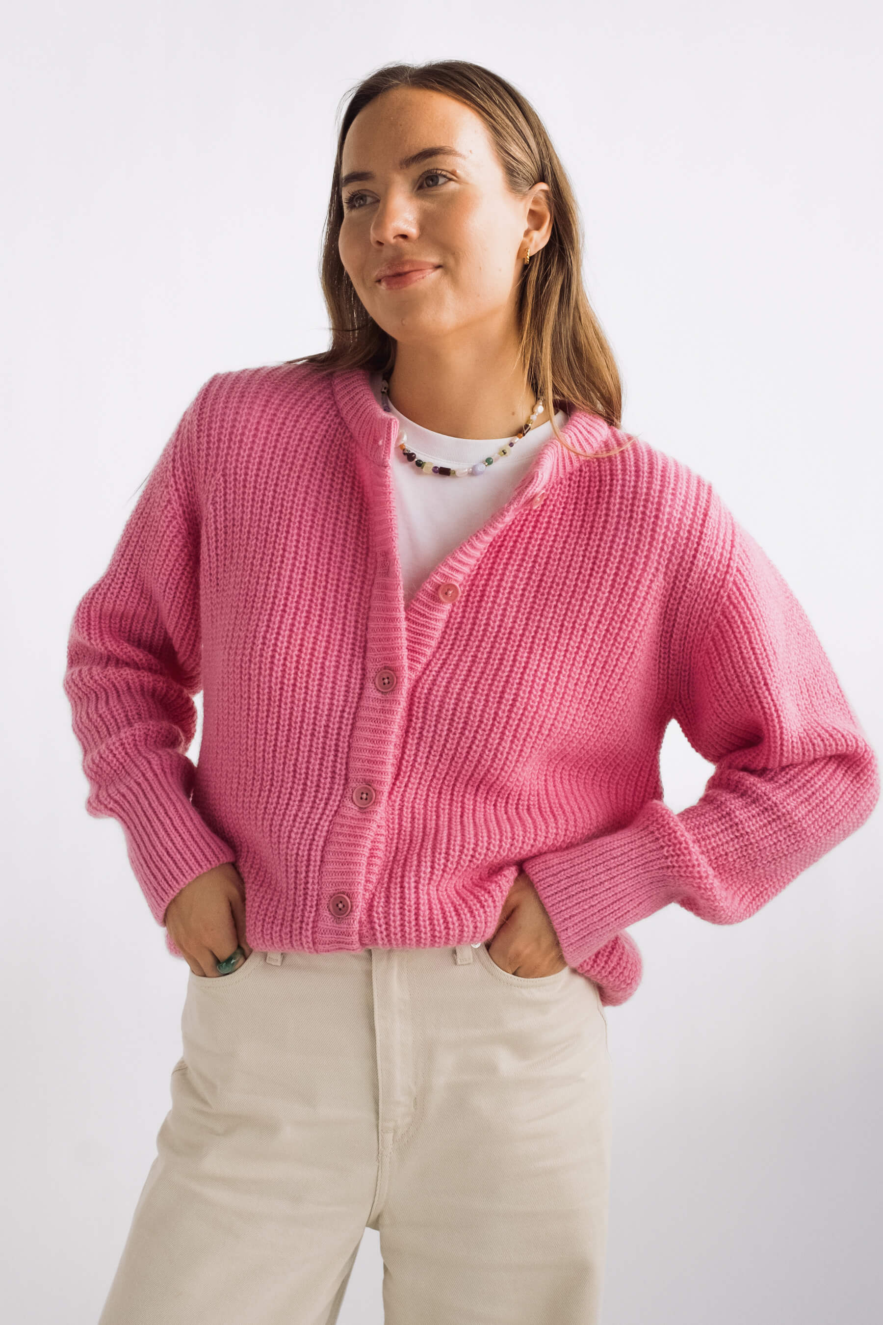The Lola pink mohair-wool cardigan brings softness and warmth to your wardrobe. It’s that standout piece that makes even the simplest outfit come alive.
