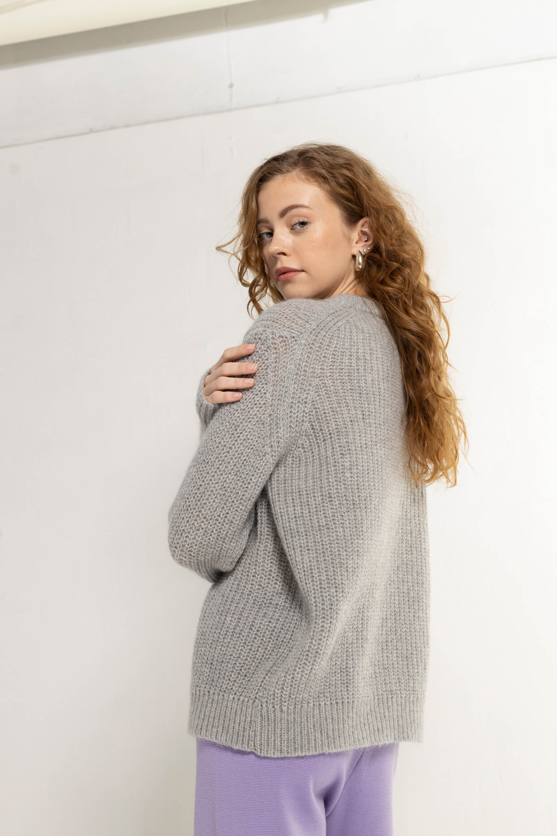 The Lola grey mohair-wool cardigan is minimalistic and timeless. It’s the perfect everyday piece that works with almost anything. Combine it with jeans, different dresses, or with tailored trousers. This cardigan adds a perfect subtle layers to your outfit.