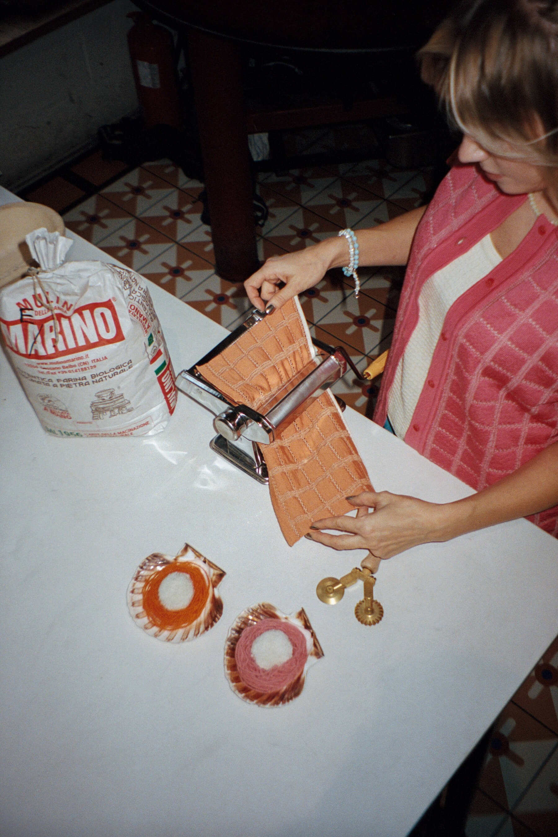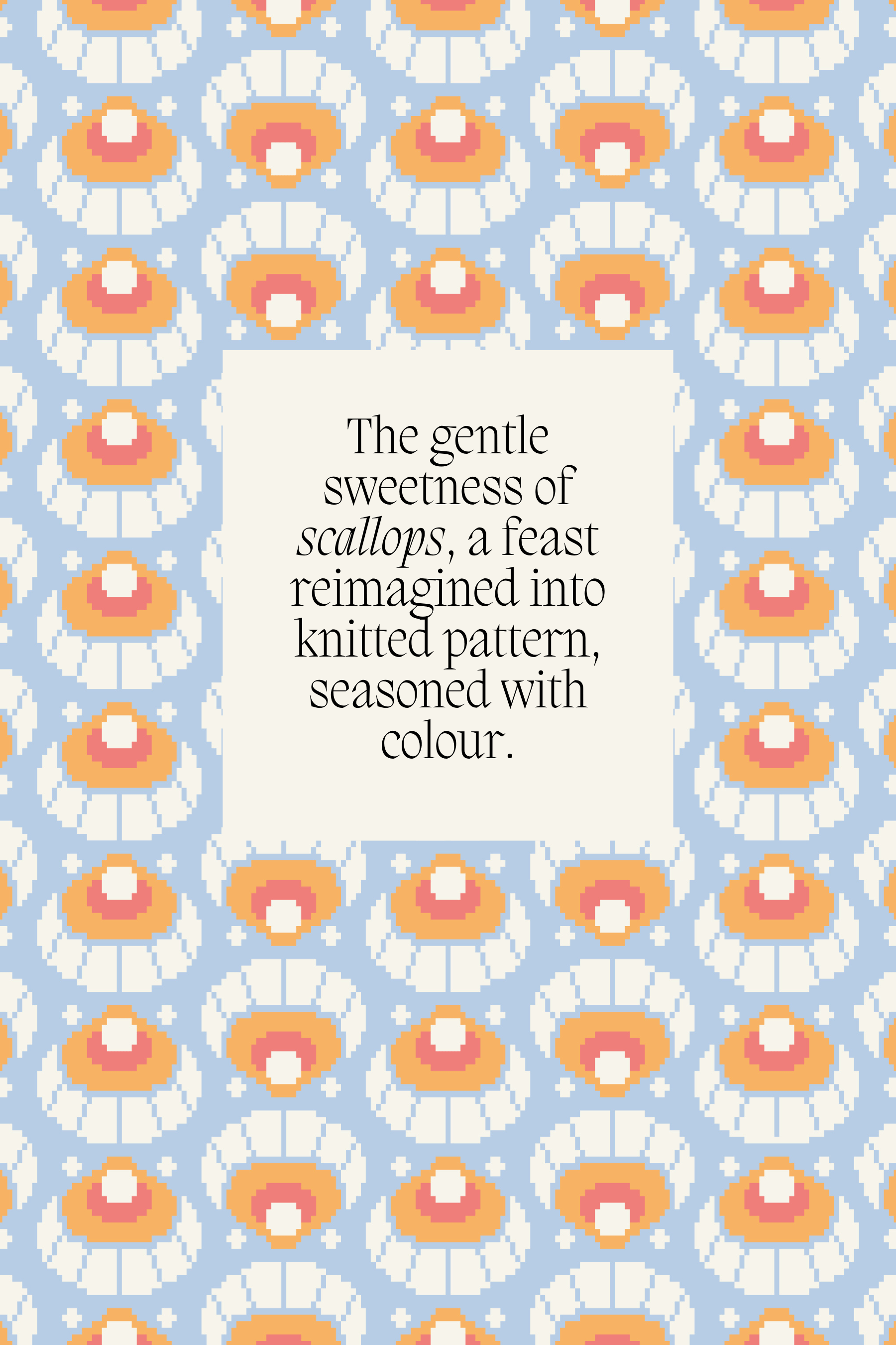 Like the cherished recipes passed down through generations, each piece blends heritage with a fresh perspective, combining merino wool yarn with contemporary patterns and textures inspired by shrimp, scallop, ravioli, and citrus. It’s a celebration of the hands that knit and cook, creating something timeless yet exciting.